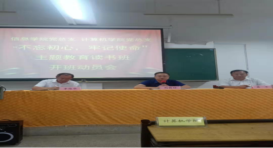 本次指导分为二个部分。一是开展“不忘初心,牢记使命”主题教育读书班开班动员会。会上计算机学院党总支书记龚平以“坚定理想信念 引领学生成长 倾力培养新时代合格的社会主义建设者和接班人”为题作发言,强调一要加强理论学习,深刻领会主题教育的深远意义;二要坚定理想信念,在强化精神支柱上下功夫;三要加强政治建设,在践行对党绝对忠诚上见行动;四要牢记根本宗旨,在促进党心民心交融上出实效;五要带头干事创业,在推动学校事业发展上有作为。要结合我院实际,树立“大思政”观念,让思政元素融入计算机专业课堂,并在此基础上探索“专业思政”,将思想育人贯穿从专业理论到专业实践、从专业氛围到专业文化的人才培养全过程之中。校长刘前信肯定了龚平书记的发言,提出一要提高认识,强化自身党性修养;二要注重方法,切实提高工作效率;三要严格要求,不断提升自身综合素质。用习近平新时代中国特色社会主义思想为“纲”和“魂”,通过读原著、学原文、悟原理,以“理论学习有收获、思想政治受洗礼、干事创业敢担当、为民服务解难题、清正廉洁作表率”为具体目标,把全体教师的理论学习成果转化为促进学院发展稳定的实际行动,推进“不忘初心,牢记使命”主题教育在学院建设中落地生根。