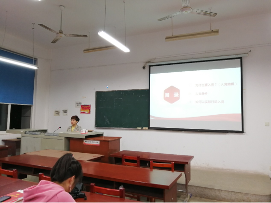 熊文老师引导同学们了解了党的章程、及其他法规制度。使得同学们对党的性质、基本要求、理想目标以及党员义务和权益有了更深的理解,也更加坚定了入党的决心。