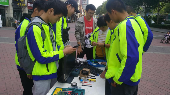 在小区门口广场,志愿者们拉起横幅,铺开“义务维修电脑”的摊子,开始为社区居民提供咨询服务和上门维修服务。鲜艳的志愿者服装、专业的检测维修装备、热情洋溢的服务态度引来了许多社区居民驻足。