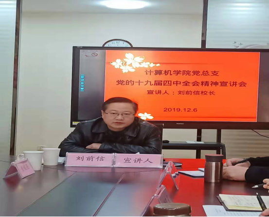 刘校长从理论到实践,从宏观到微观精炼地讲解了四中全会的主要精神,指出计算机学院广大干部要结合学院发展实际贯彻落实全会精神,第一要思想自觉,即强化习近平新时代中国特色社会主义细思想学习,将主题教育的成效体现在学院的高质量发展之中,把十九届四中全会精神转化为发展的新动能。第二要政治自觉,即提高政治站位,做到“两个维护”,坚持“教学为中心”的理念发展。第三要行动自觉,即继承和发展过去的好做法、好经验,以问题为导向,解决现实问题,以求真务实的作风追求实效。
