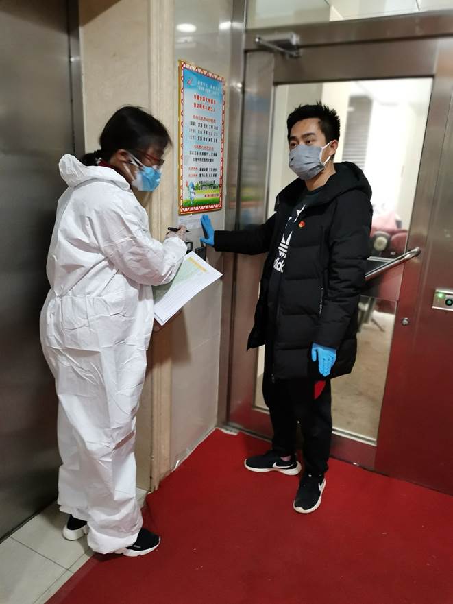 工作不仅辛苦,有时候风险也不小。前几天,社区回来了一个医院治愈的病人,吃完饭还喜欢在小区内散步,因为有治愈病人转阳的前车之鉴并且市政府也出台了集中隔离的政策,就需要工作人员配合警务人员一起将病人送去隔离中心。在没有任何专业防护设备的情况下,杨玉香老师克服心中的恐惧,戴着简单的防护口罩还是跟着警务人员一起上门,细心沟通,最终将病人平安地送至集中隔离点。