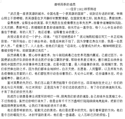 同时,我院还组织开展了以《缅怀革命先烈》和《缅怀抗疫烈士》为主题的征文活动,收到同学们的踊跃投稿。