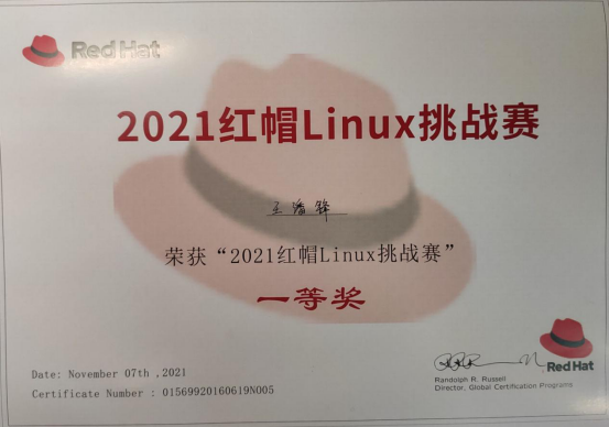 2021年11月7日,云计算专业王潘锋、刘俊杰等参加了“2021红帽Linux挑战赛”省赛决赛,王潘锋荣获一等奖第一名,将作为湖北省唯一选手参加红帽中国区决赛。