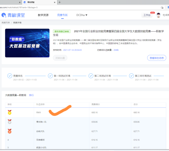 2021年11月7日,云计算专业学生参加了2021年全国行业职业技能竞赛暨第四届全国大学生大数据技能竞赛(职教学生组)线上选拔赛,RWX团队(杜成帝,廖伏明,杨毅鑫)取得第一名,996团队(万鹏,胡鹏翔,刘俊杰)取得第六名的好成绩,已成功晋级国赛。