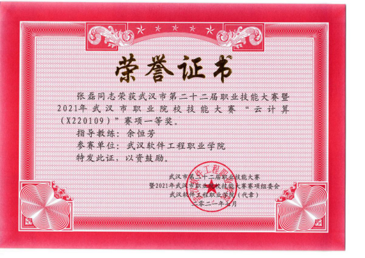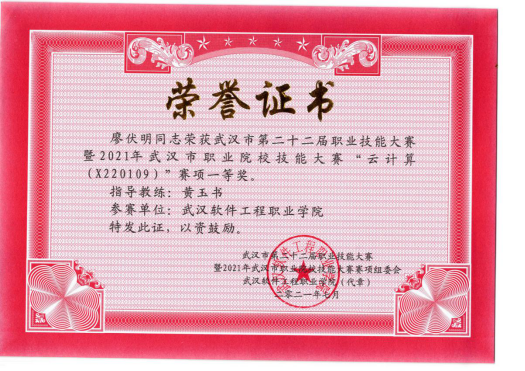2021年7月3日,计算机学院承办了武汉市第二十二届职业技能大赛暨2021年武汉市职业院校技能大赛云计算赛项,市委组织部、市委宣传部、市人社局、市科技局、市经信局、市财政局、市总工会、团市委决定联合举办。云计算专业杜成帝,张磊,廖伏明荣获一等奖,杨毅鑫,胡鹏翔,王潘锋荣获二等奖,刘俊杰,段守鑫,胡渐飞,程陈,邓文杰荣获三等奖。杜成帝和张磊分别排名第一和第三。