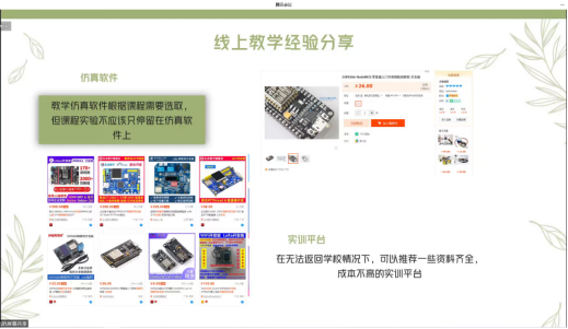 叶飞老师讲述了《物联网概论》课堂中的故事,为了提升概论性课程的趣味性,他从上个学期开始一直就在网上收集相关资料为本学期的讲解做准备。在线上教学的过程中,他通过投屏软件实时讲解手中的实验设备,让学生能透过镜头近距离地接触这些设备,这一教学手段得到了学院院长谢日星的高度肯定。为了解决线上教学实操困难的问题,叶老师从众多设备中精挑细选出了一个性价比高、配套资源齐全的开发板作为课外学习资源,提供给学有余力的学生们。同时,叶老师分析了线上教学的优势,线上教学能节约老师们的通勤时间,让备课时间更加充裕,线上教学的回放也能让学生们查漏补缺。最后,他强调了线上教学的纪律性问题,希望老师们以身作则,遵守教学规则,做好学生们的领路人!