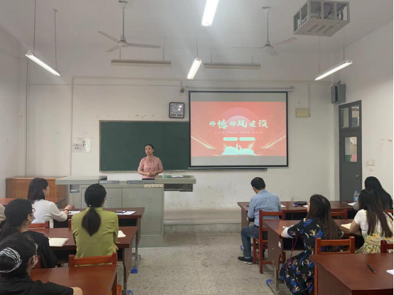 接着,肖书记以“师德师风建设”为题,为全体教职工上了生动的一课。她指出,在全国人民为实现“两个一百年”奋斗目标和中华民族伟大复兴中国梦而努力拼搏的新时代,加强师德师风建设有着重要的现实意义。她带领全体教职工解读了《新时代高校教师职业行为十项准则》等文件并观看了“时代楷模”曲建武的英雄事迹,号召全体教职工向楷模学习,要在教学实践中不断提高师德修养,形成良好的育人风气,以实际行动践行教育工作者的初心。