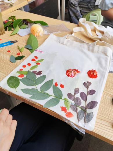 “绿叶拓染”区域则弥漫着艺术与自然交融的气息。同学们来到材料区领取拓染材料后,便开始精心处理采集的新鲜叶片。洗净、浸泡、晾干,每一个步骤都充满期待。在创作时,大家充分发挥创意,将叶片以对称、渐变、抽象等造型铺展在棉麻织物上,用小锤子耐心敲击。拓染完成后,同学们小心翼翼地在作品内侧贴上姓名贴等待展示,同时与他人分享创作背后的故事,现场交流声、赞叹声此起彼伏,艺术与心灵的碰撞在此刻绽放出绚丽的火花。
