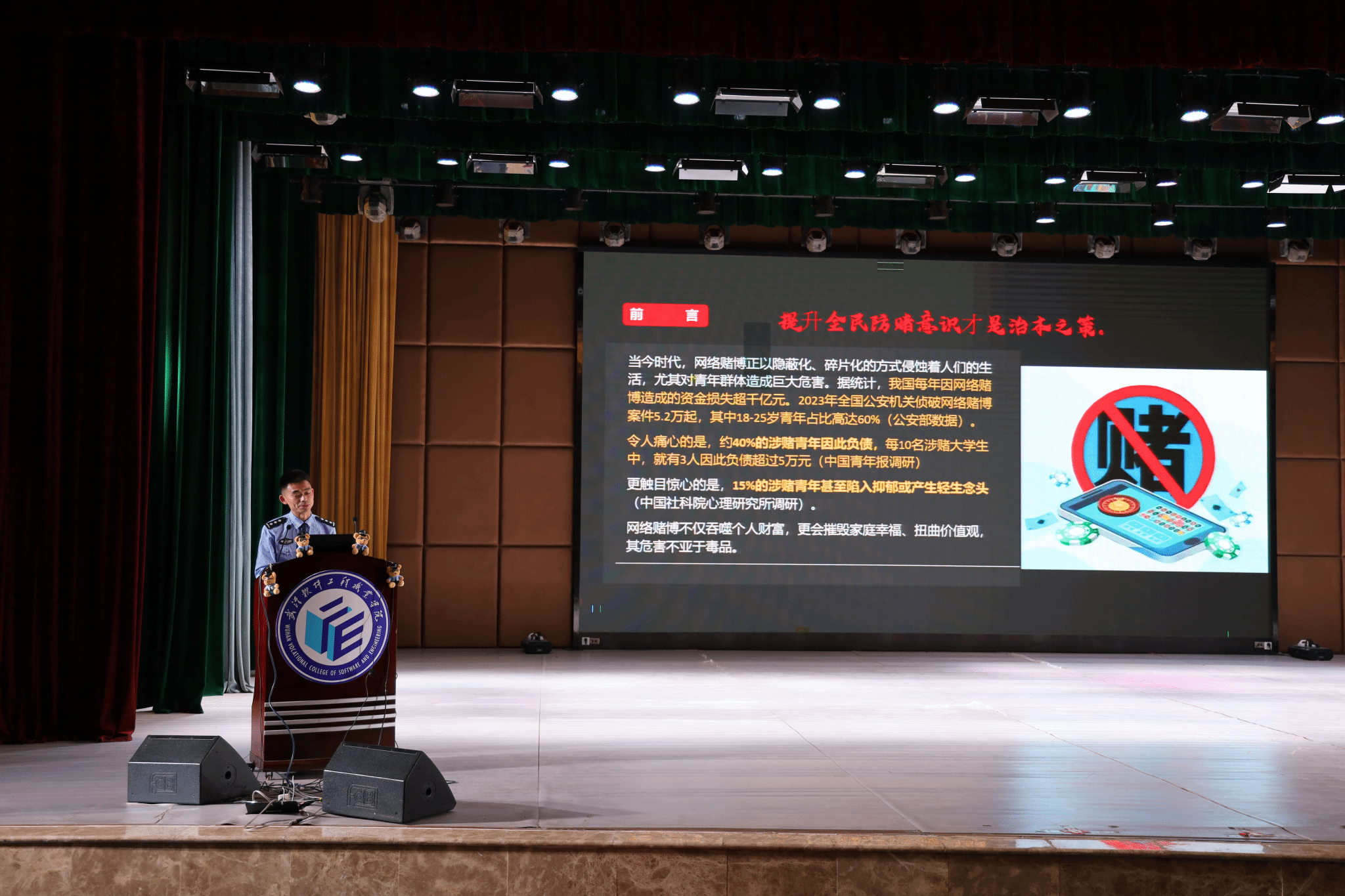 随后,武汉市公安局治安支队民警童振军为学子们带来“反诈拒赌、十赌十诈”主题讲座,他从电影《孤注一掷》切入,深入剖析常见诈骗套路及涉赌危害,将实用的防范技巧和法律知识生动、精准地传达给在场学生。互动环节气氛热烈,同学们踊跃参与“涉赌诈术甄别”,准确辨识出警官展示的各类诈骗手段和涉赌场景,赢得民警们的高度认可。