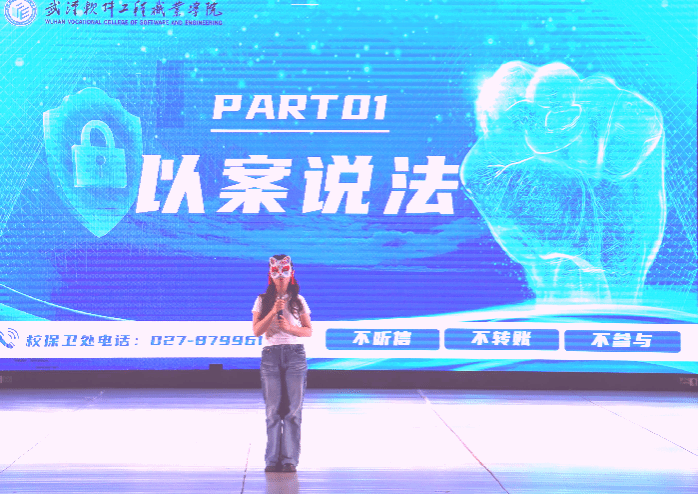 活动第一环节是“以案示警接套路”,四位曾遭遇电信网络诈骗的同学勇于站上讲台,以自身真实受骗经历进行现身说法。他们讲述了如何落入看似简单却极具迷惑性的诈骗圈套,深刻揭示了骗局的隐蔽性和手法演化,为全场同学敲响了警钟。