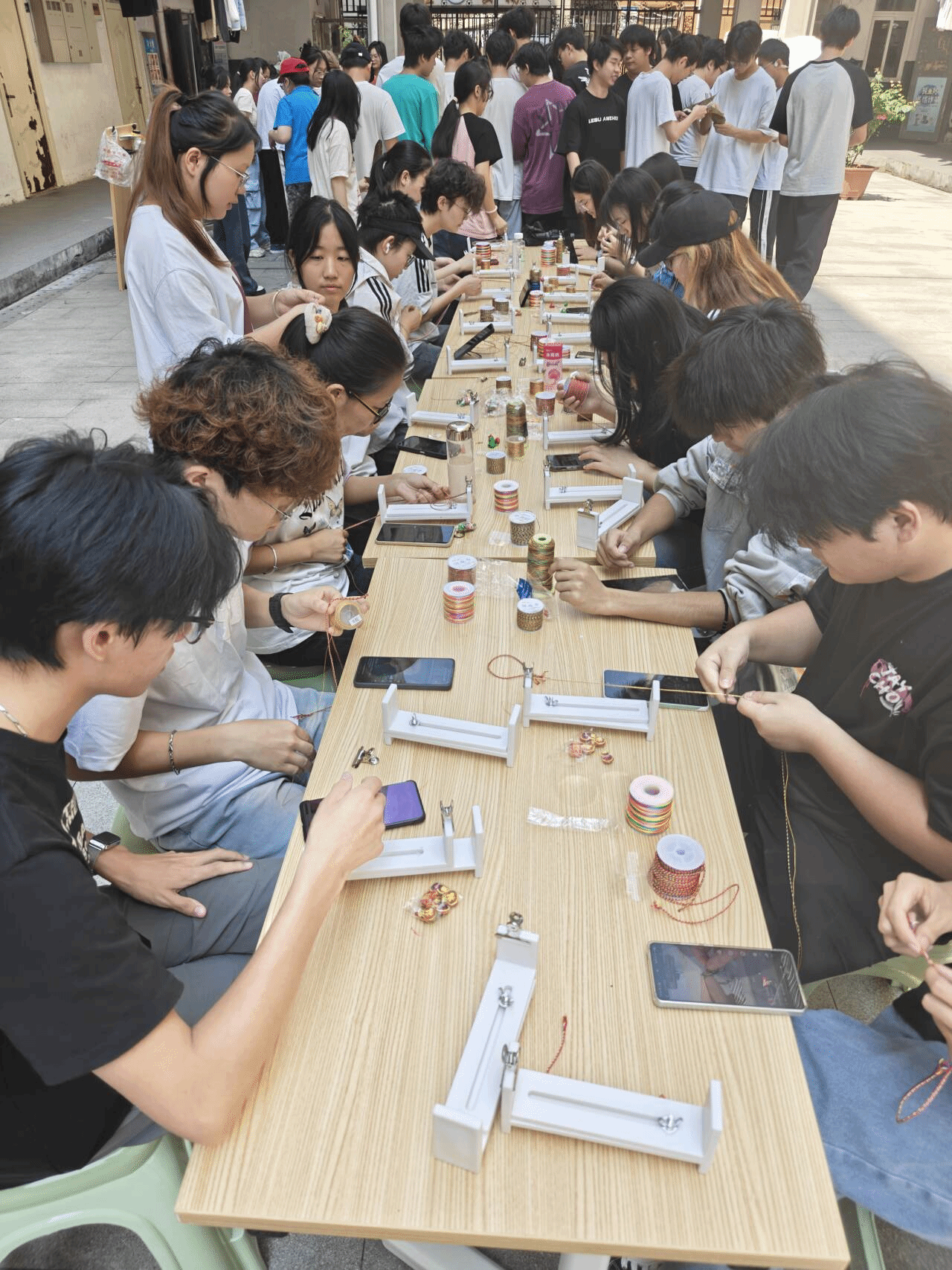 五彩绳编织区同样气氛热烈。学生们围坐一起,兴致盎然地学习编织技巧,互相交流切磋。绕线、打结,普通的丝线在巧手下逐渐变成精致美观的绳结。现场欢声笑语不断,洋溢着互相合作的温馨。学院辅导员也积极参与其中,与学生们共同感受传统民俗乐趣,在互动中增进了师生情谊。