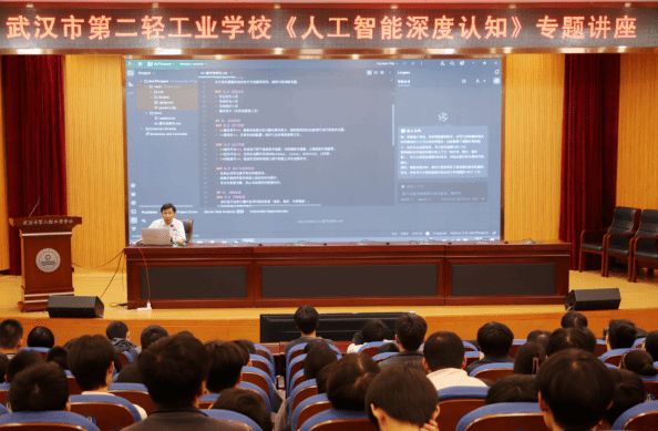 此前5月30日,我院谢日星院长便前往武汉市第二轻工业学校,为该校计算机专业师生及AI爱好者带来精彩培训,吸引了240余名师生前来聆听。讲座中,谢院长系统阐释AI核心概念与发展历程,针对“AI替代焦虑”,他指出:“技术迭代催生新机遇,唯有主动拥抱、提升跨学科能力,方能在智能时代保持竞争力。”在互动环节,谢院长以“春游追赶问题”为切入点,借助DeepSeek-R1推理模型拆解复杂逻辑,直观展现AI在数学建模与路径规划中的卓越效能。他结合全球AI发展数据,分享中国实验室在技术研发上的突破性进展,当提及DeepSeek-Rl等模型逼近国际先进水平时,现场师生备受鼓舞,民族自豪感与创新热情被充分点燃。