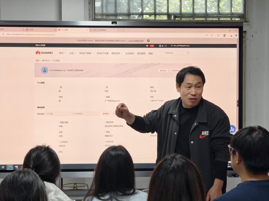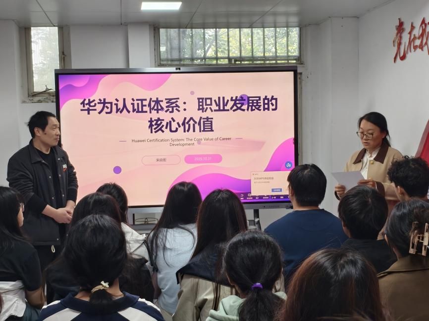 紧接着,宋焱宏老师登台开讲。他首先深入介绍了华为生态圈以及华为相关证书,使同学们对华为体系下的各类证书有了全面且清晰的初步认识,为同学们勾勒出一个宏观的考证蓝图。随后,宋老师紧密结合学院各专业的实际情况,细致入微地讲解了不同专业所适配的证书类型,并依据多年的教学经验给出了切实可行的考证建议。他强调,同学们应根据自身专业特点和职业规划,精准选择适合自己的证书,避免盲目跟风。