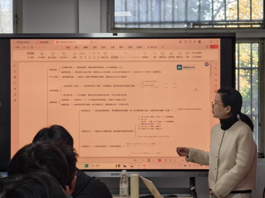 本次讲座邀请了学院具有丰富C语言教学经验的曹廷老师主讲。她开篇便展示了精心制作的思维导图,清晰罗列了C语言考试的重点模块,从数据类型、运算符与表达式,到函数、指针、数组等核心内容,再到常见难点易错点,让同学们对考点分布一目了然。曹老师结合历年真题,按思维导图顺序逐一拆解,针对高频难点,通过典型例题分析解题思路,帮助同学们突破理解瓶颈。