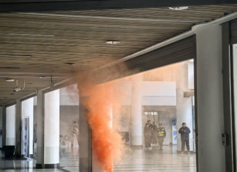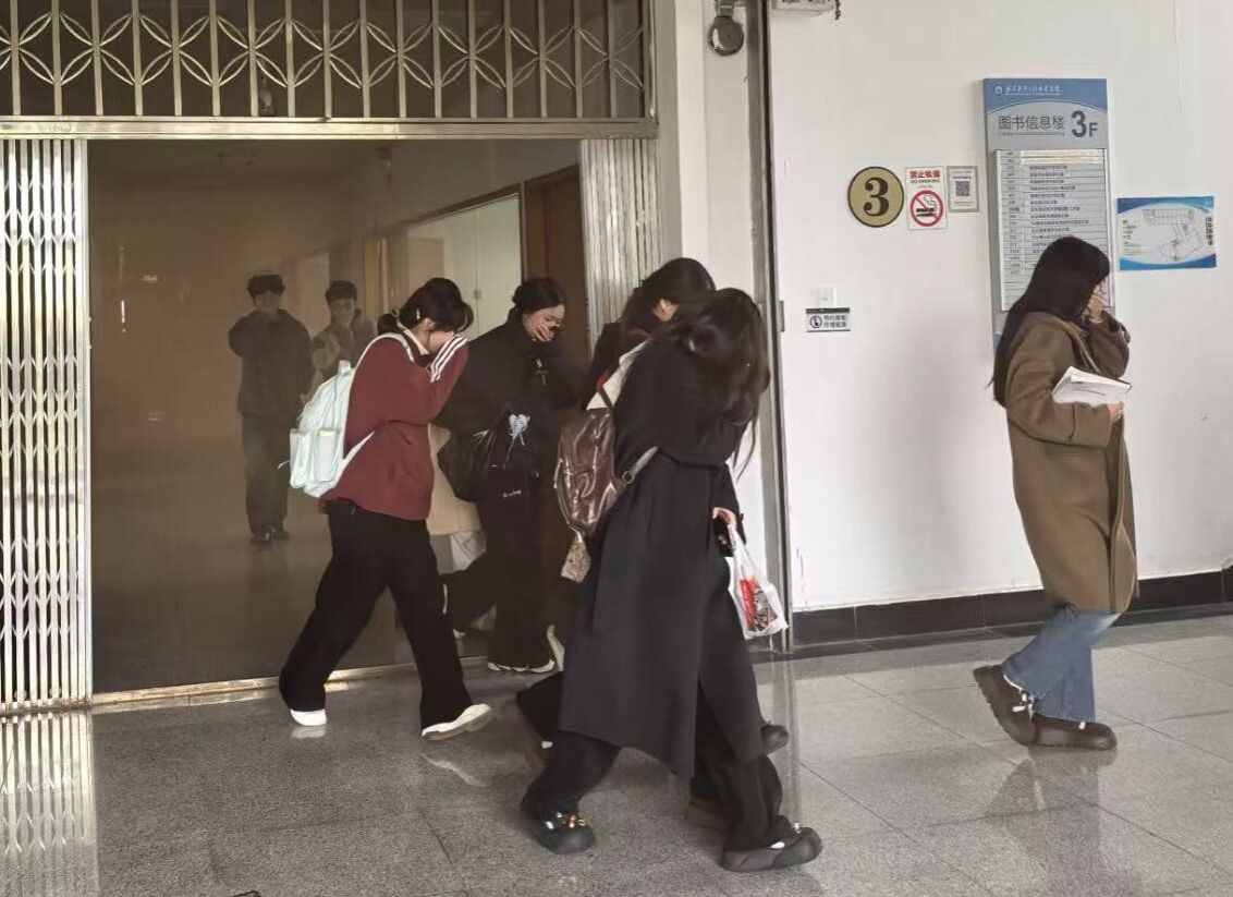 15:00,演练正式启动。随着3个着火点的烟雾弹依次投放,现场迅速模拟出火灾场景。疏散引导组教师立即响应,按照预定路线,引导1-5楼机房及自习阅览室的师生弯腰捂鼻、低姿前行,有序撤离至图书馆前后空旷集合点。过程中,工作人员重点关注特殊群体,确保不遗漏一名师生。抵达集合点后,各责任单位迅速清点人数并上报指挥组,经汇总确认,全体参与人员均安全撤离。