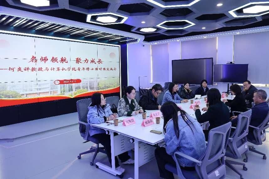 随后,何教授与我院青年博士教师代表移步创新创业大楼开展座谈交流共话成长,学校科技处副处长易小芳、学院党总支书记周娅参加座谈。