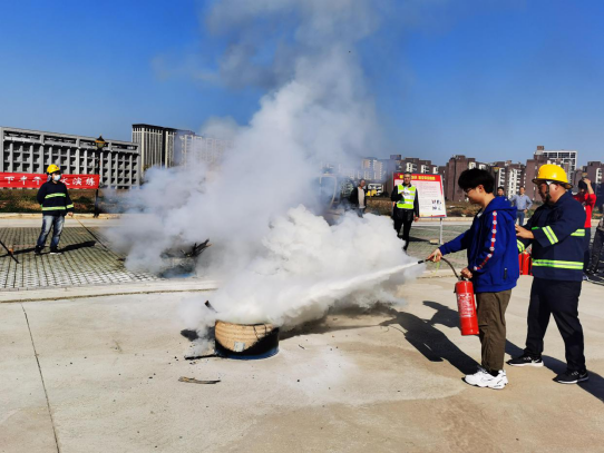 在同学们有序撤出楼栋以后,由各辅导员老师带队,将撤离学生引导至武软客厅停车场,并组织开展本次消防演练的第二个项目——灭火实操演练。在演练开始前,保卫处处长陈文强对广大计算机学子的火灾疏散演练表示赞赏,并要求同学们要警钟长鸣,时刻不忘消防安全的重要性。随后,在消防培训学校的培训之后,广大计算机师生开展了灭火器操作演练,随着一道道白色的粉雾从灭火器中快速喷出,燃料桶里的熊熊火焰瞬间被消灭。