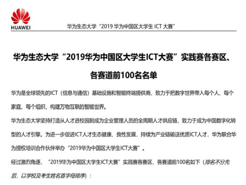 (通讯员余恒芳)华为生态大学“2019华为中国区大学生ICT大赛”实践赛中部赛区高职组云计算基础设施赛道前100名成绩在官网(ht…[详细]